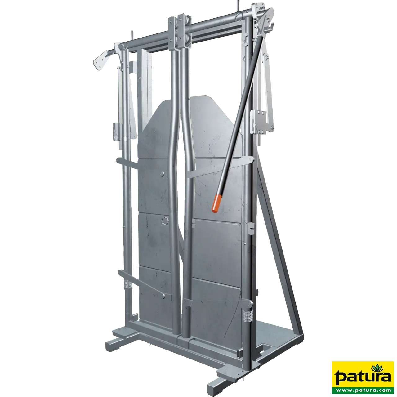 Achter de halsvastzetinrichting worden 2 panelen van 3 m lengte gebouwd, waarbij er een met een deur uitgevoerd moet worden. De afsluiting naar achteren vormt een schuifpoort. (panelen en schuifpoort extra bestellen)
