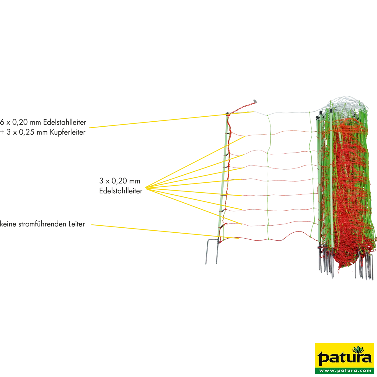 Bovenste stroomvoerende streng 6 x , 2 mm roestvrijstalen geleiders + 3 x , 25 mm koperen geleiders, onderste strengen elk met 3 x , 2 mm roestvrijstalen geleiders; aardgeleider met 16 x , 2 mm roestvrijstalen geleiders